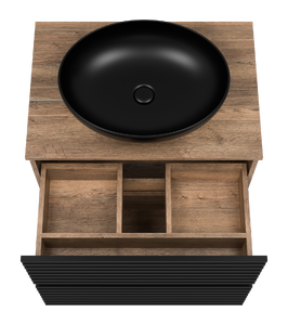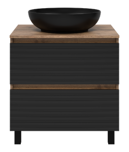 Тумба под раковину Brevita Dakota 70 черная оснащена двумя выдвижными ящиками, которые установлены на направляющих скрытого монтажа с доводчиками. Верхний ящик разделен на несколько отсеков перегородками. Тумба поставляется с цельной столешницей без отверстий, что позволяет выбрать удобное расположение накладной раковины.
