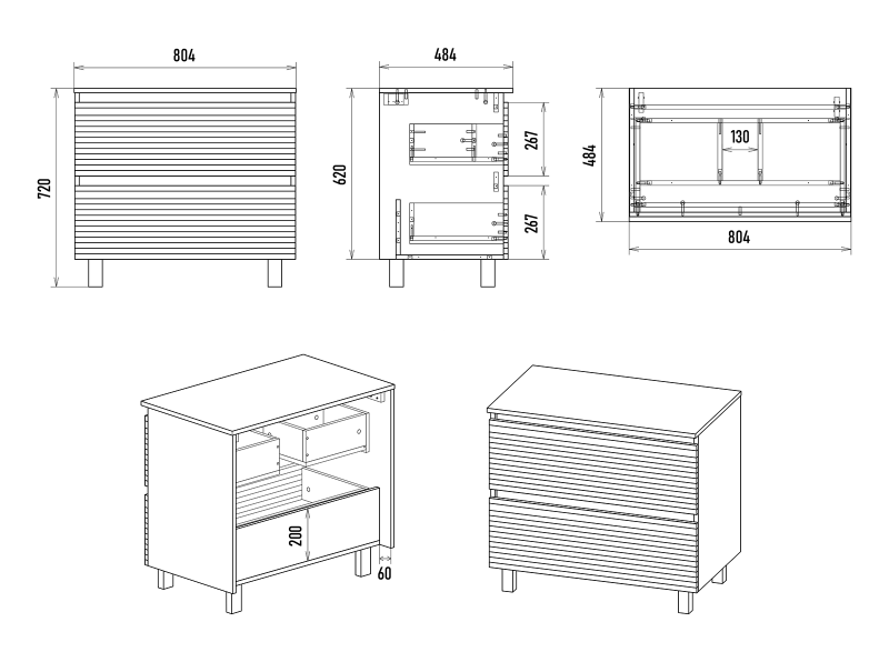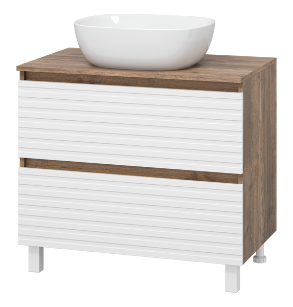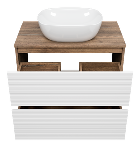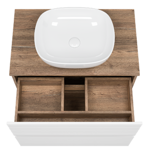 Тумба под раковину Brevita Dakota 80 белая оснащена двумя выдвижными ящиками, которые установлены на направляющих скрытого монтажа с доводчиками. Верхний ящик разделен на несколько отсеков перегородками. Тумба поставляется с цельной столешницей без отверстий, что позволяет выбрать удобное расположение накладной раковины.