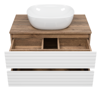 Тумба под раковину Brevita Dakota 80 подвесная белая оснащена двумя выдвижными ящиками, которые установлены на направляющих скрытого монтажа с доводчиками. Верхний ящик разделен на несколько отсеков перегородками. Тумба поставляется с цельной столешницей без отверстий, что позволяет выбрать удобное расположение накладной раковины.