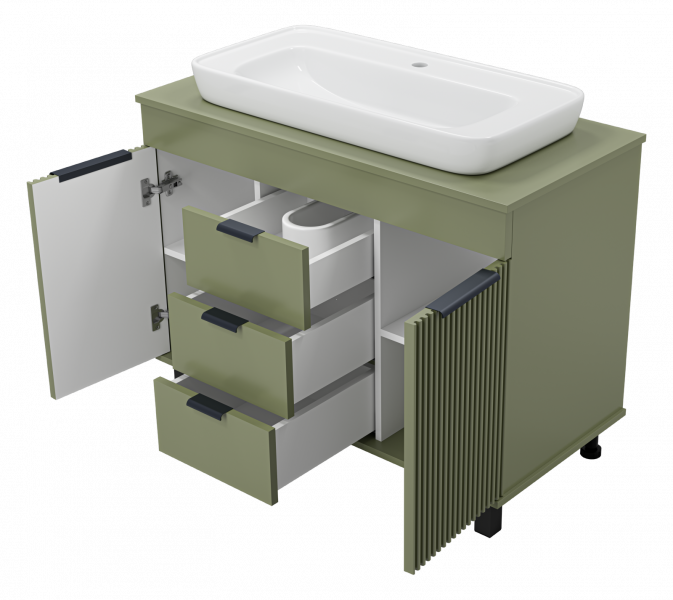 Тумба Brevita Enfida 100 зеленая оснащена двумя боковыми дверцами и тремя выдвижными ящиками в центре. Направляющие с доводчиками обеспечивают бесшумное и плавное закрывание.