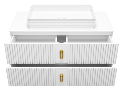 В основе коллекции лежат подвесные тумбы с двумя ящиками, выполненные в белоснежной глянцевой эмали. Такой выбор цвета не только придает мебели изысканность и шик, но и визуально расширяет пространство, делая вашу ванную комнату светлее.