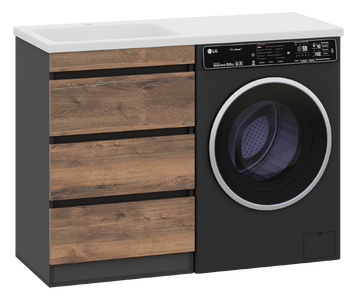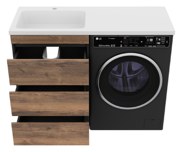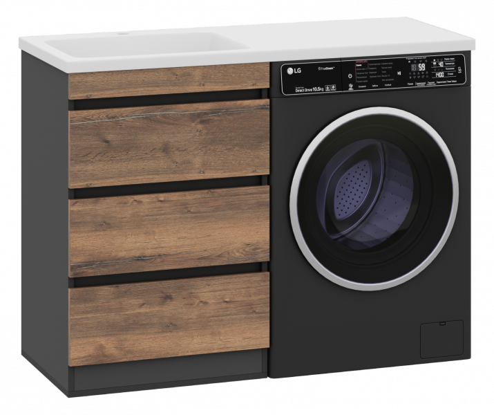 - Продуманная функциональность: тумба идеально подходит для интеграции стиральной машины, сохраняя при этом место для хранения аксессуаров и бытовой химии.