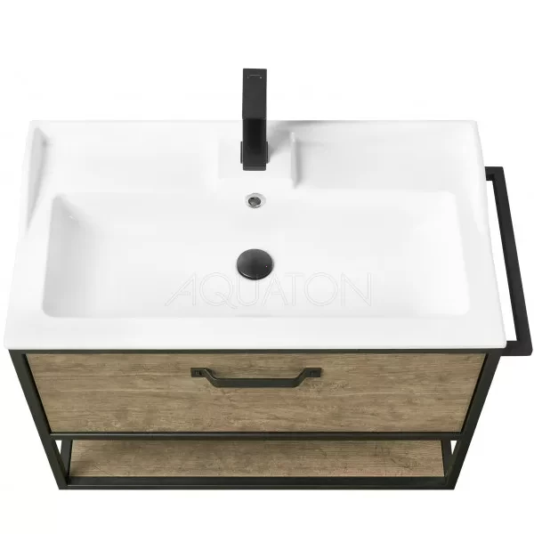 Тумба Лофт Фабрик 80 в цвете Дуб Кантри – это сочетание насыщенного древесного декора и благородства металла. Удобный вместительный ящик, снабженный направляющими плавного выдвижения, и открытая нижняя полка позволят разместить все необходимое. Для данной тумбы доступно три варианта комплектации: с керамической раковиной Victoria от бренда Roca, с раковиной Фабиа 80 из прочного литьевого мрамора и с накладной керамической раковиной на столешницу, столешница заказывается отдельно. Оригинальная ручка идеально сочетается с металлическими черными профилями и полотенцедержателем. Полотенцедержатель можно установить опционально по желанию клиента слева или справа.
