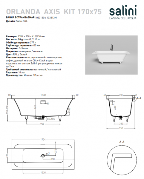 Ванна из искусственного камня Salini ORLANDA AXIS KIT 170x75