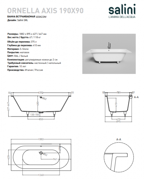 Ornella Axis Ornella Axis — универсальная ванна Salini из литого камня, отличающаяся просторной чашей идеально округлой формы. Вневременная эстетика и чистые линии корпуса ванны делает её уместной и желанной как в классическом, так и в современном интерьере. Ванна предназначена для полного или частичного встраивания, а также для любой установки - пристенной, угловой или отдельностоящей. Красавица Ornella характеризуется одинаковым пологим уклоном бортов и расположенными посередине сливом-переливом и донным клапаном. Название модели Axis («Ось) отражает характерную симметрию ванны во фронтальной проекции. Помимо установки на пол, ванна может быть полностью или частично встроена в пол или подиум. В последнем случае, ванна также оснащается декоративными экранами, высота которых адаптируется по запросу. Ванна может быть дополнена ревизионным люком, вырезанным во фронтальном экране для доступа к сифону. Люк с тонким контуром, находящийся в одной плоскости с экраном, гарантирует безупречную эстетику этой лаконичной модели. Таким образом, одна и та же универсальная модель от Salini способна обладать параметрами, соответствующими персональному запросу, встраивается в любое предназначенное для нее пространство и удовлетворяет всем критериям современного качества жизни.
