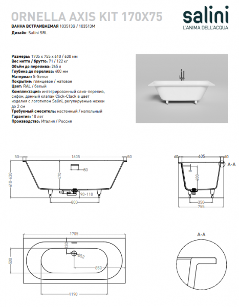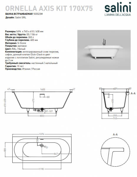 Ванна из искусственного камня Salini ORNELLA AXIS KIT 170x75