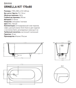 | Комплектация | ванна, регулируемые ножки до 2 см, интегрированный слив перелив, донный клапан цвет белый |