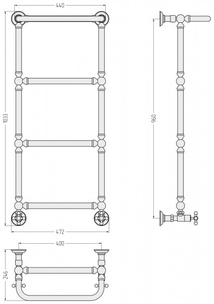 НИЖНЕЕ ПОДКЛЮЧЕНИЕ. В комплекте есть всё необходимое для нижнего подключения полотенцесушителя «в стену». Запорно-регулирующие вентили выполнены в едином стиле с полотенцесушителем и также входят в стандартную комплектацию.