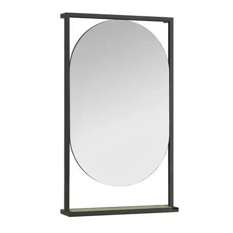 Зеркало Лофт Фабрик в размере 50 отличается необычным оригинальным дизайном и удобным функционалом. Черные металлические профили в форме прямоугольника обрамляют овальное зеркало, под которым находится полочка из влагостойкой ламинированной плиты в цвете Дуб Эндгрейн. Открытая полочка удобна для косметических и декоративных мелочей, которые всегда должны быть под рукой.