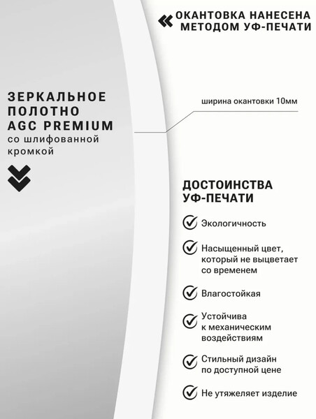 - Зеркальное полотно премиального качества AGC со шлифованной кромкой не искажает и не затемняет отражение.