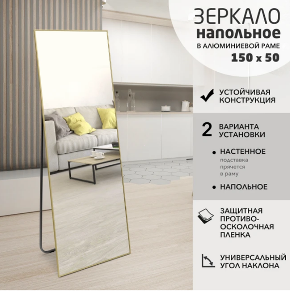 Минималистичный дизайн зеркала впишется в любой интерьер. Благодаря особому виду креплений, зеркало может быть установлено напольно, либо выполнять роль настенного. Рамы для зеркал изготовлены из экструдированного алюминия и представлены в трёх цветах: серебро, золото и чёрный. Благодаря особому способу обработки алюминия, такие рамы имеют ряд преимуществ - лёгкие по массе, надёжность (выдерживают закреплённое зеркало большого веса), металл обладает высокой прочностью, долговечность, устойчивость к механическому воздействию и ультрафиолету, а также перепадам температур и влажности, а самое главное - стильный и эстетичный внешний вид.