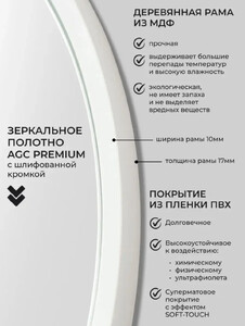 - Зеркальное полотно AGC категории премиум не искажает и не затемняет отражение. Заднее основание — МДФ с влагостойким покрытием.