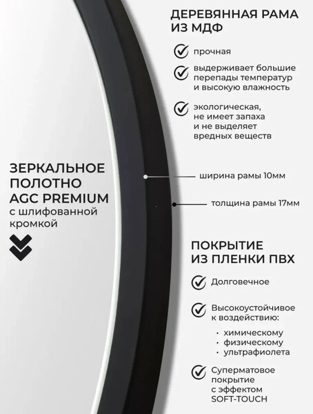 - Зеркальное полотно AGC категории премиум не искажает и не затемняет отражение. Заднее основание — МДФ с влагостойким покрытием.