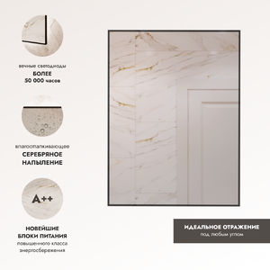 Зеркало с подсветкой снабжено также запатентованной технологией безрамочного пространства. Благодаря этой технологии зеркало выглядит особенно стильно и современно. Отсутствие видимой рамы придает зеркалу легкость и минимализм, делая его идеальным дополнением для современного интерьера.