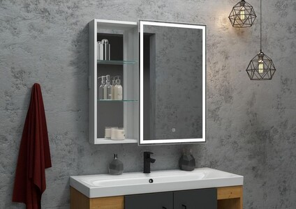 Зеркало-шкаф для ванной комнаты. В комплектацию входит встроенная LED-подсветка, которая обеспечит мягкое и ровное свечение по периметру всего изделия, и сенсорный выключатель с диммером, который позволит включить и отрегулировать яркость подсветки в одно касание. Большим преимуществом также является влагостойкий корпус, розетка для электроприборов, фурнитура с доводчиком для плавного закрывания двери. Потребляемая мощность 30 W.